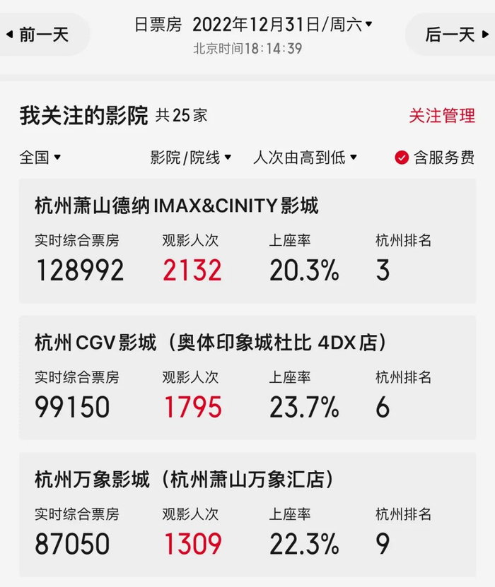 看电影的人也多起来了。截至昨天下午6点多,杭州萧山3家电影院观影人次超过1000。而在上周六的平安夜,全天客流最多的电影院也不过五六百人。