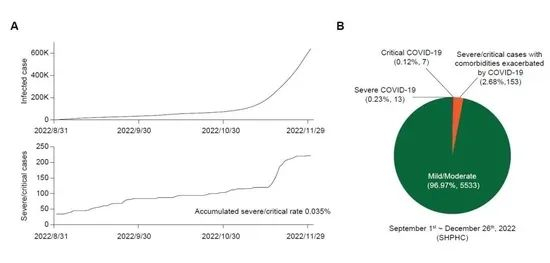 根据一般规律,高危人群在入院2-3周后演变为重症危重症患者因此,研究团队对2022年9月1日至2022年12月26日期间上海公卫中心收治的5706名有症状新冠病毒感染患者临床演变进行了分析,经过综合医学观察和诊断,其中5533名患者表现为轻型和普通型(总占比96.97%),其余173名患者进展成重症/危重症(总占比3.03%),其中包括20名仅有新冠感染者(0.35%)和153名伴有因新冠感染而加重的基础疾病患者(总占比2.68%)。