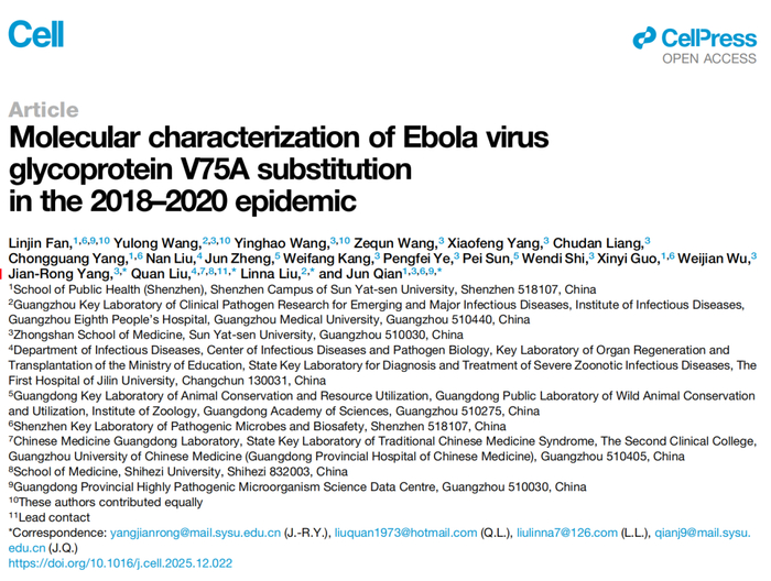 刘全教授团队以及中山大学杨建荣教授团队(范林进、王雨龙、王英豪为论文共同第一作者),在国际顶尖学术期刊 Cell上发表了题为:Molecular characterization of Ebola virus glycoprotein V75A substitution in the 2018–2020 epidemic