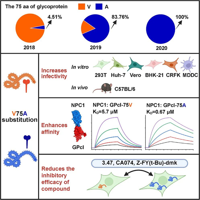 2018 - 2020 年的埃博拉疫情促进了病毒变异的出现,增强了病毒在持续人际传播过程中适应宿主的可能性在这项最新研究中,研究团队确认了埃博拉病毒(EBOV)糖蛋白 V75A(GP-V75A)替代突变体在此次疫情中为优势突变体。