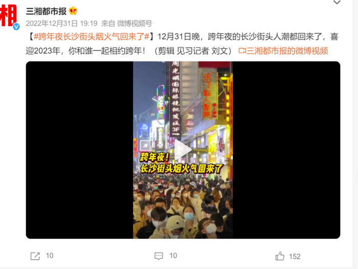 此外,跨年夜的长沙街头人潮都回来了据湖南日报报道,从12月26日起,长沙城区活跃车数、拥堵指数开始止跌回升长沙地铁数据显示,本周客流量相较上周回升50%12月31日,长沙地铁5号线将延长运营至次日2时,并计划15分钟每趟次的行车间隔加开列车,确保跨年夜市民平安归家。