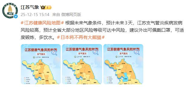 根据未来气象条件从今天起江苏支气管炎疾病发病风险较高预计全省大部分地区风险等级可达中风险其中,南京处于较高风险和中风险地区建议大家外出可佩戴口罩适度锻炼,多饮水