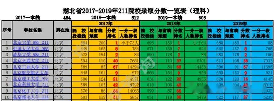 中国地质大学北京校区2019年第一次在湖北招生;西南交通大学位次变化最大,从2017年的56位,2018年的54位跌至2019年的91位除西藏大学一直在二本分数内招生外,其他211院校最低投档线高于一本线22-23-19分,相应的省内段位从2017年的7194名、2018年的7214名变化为2019年的7360名。
